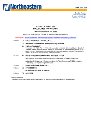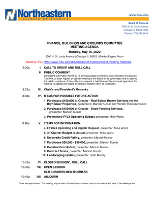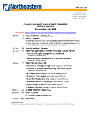 Meeting materials for the NEIU Finance, Buildings and Grounds Committee
